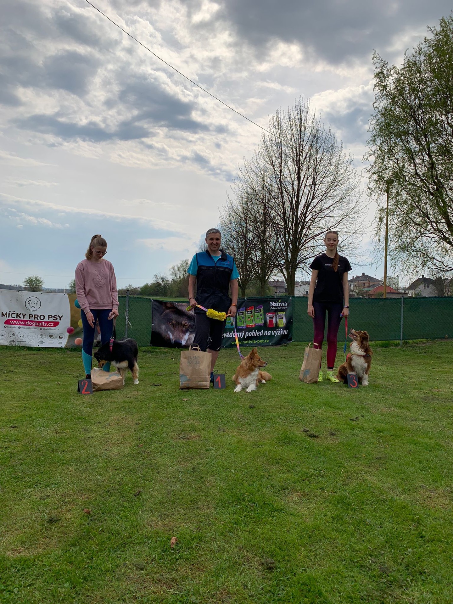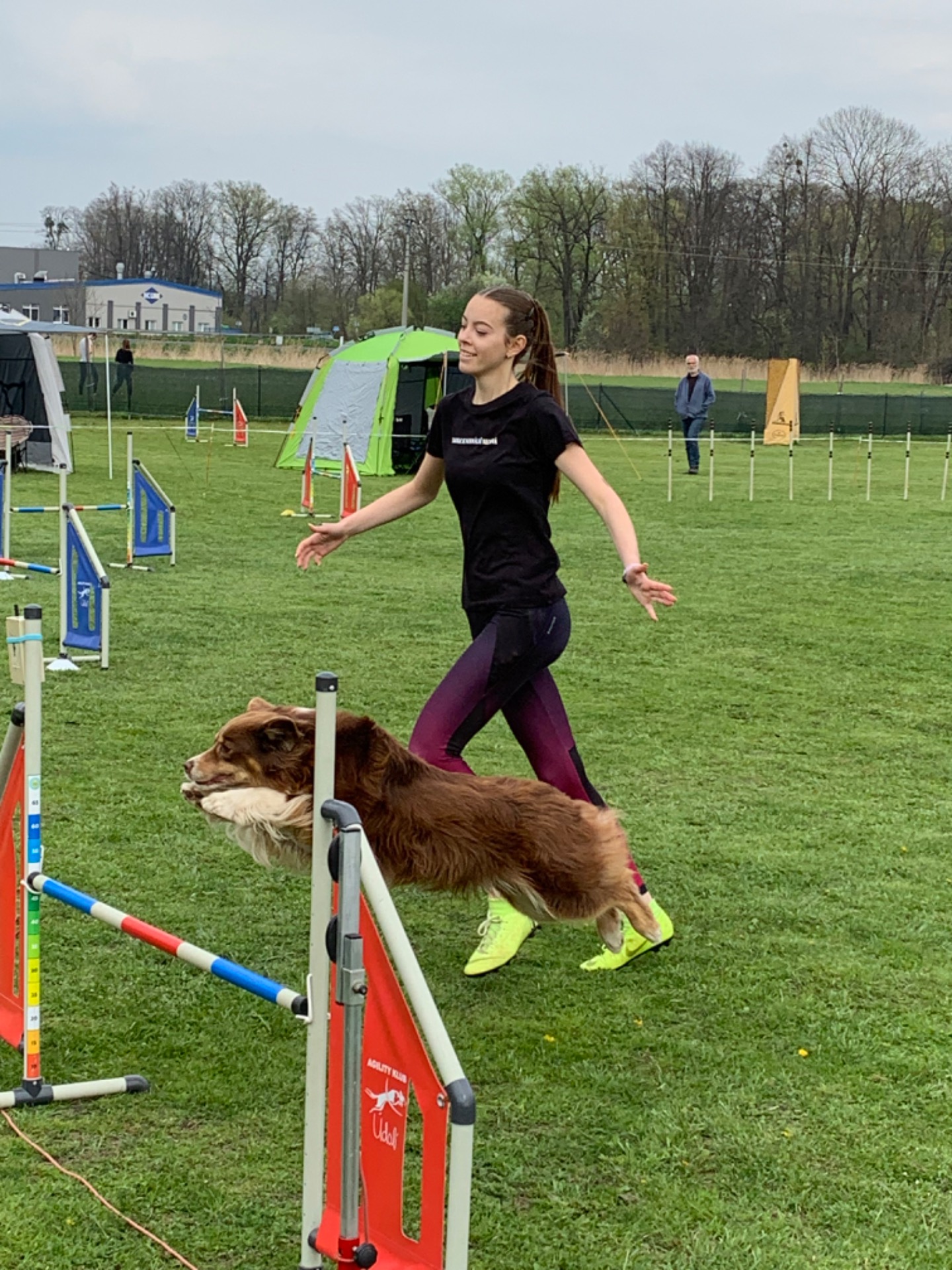 Na místě jsme zjistily, že jsou to open závody - všechny kategorie dohromady. Ano, takže my A1 na třetích závodech budeme soupeřit s A3 šampiony. To zní opravdu skvěle. No možná by to byla i zajímavá výzva, kdybychom tam netrčely od rána do večera. Běhy se děsně táhly. Dorazily jsme ráno, mysím, že před osmou. První běh jsme absolvovaly v 10:17. Parkury byly na úrovni asi A2. První běh jsme zvládly čistě, ale vypadal hrůzostrašně! Axica na mě v jednom kuse skákala, dělala hovadiny, děs! V tabulce jsme byly čtvrté, nejlepší A1, což bylo hezké. Až za 3 hodiny jsme se dostaly k druhému běhu. 2 chyby, 2 odmítnutí, 5. místo. Po sečtení jsme byly 7. ze 14. Poprvé v životě mi skočila áčko! To mě mrzelo asi nejvíce.